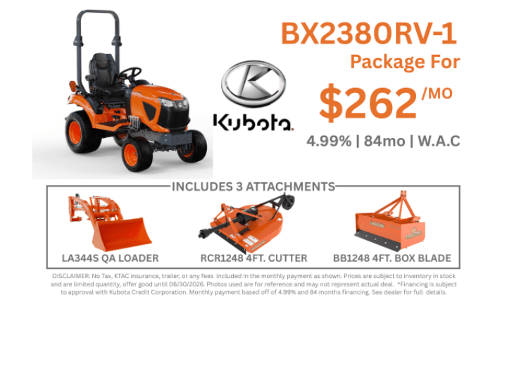 DISCLAIMER: No Tax, KTAC insurance, trailer, or any fees included in the monthly payment as shown. Prices are subject to inventory in stock and are limited quantity, offer good until 06/30/2026. Photos used are for reference and may not represent actual deal. *Financing is subject to approval with Kubota Credit Corporation. Monthly payment based off of 4.99% and 84 months financing. See dealer for full details.